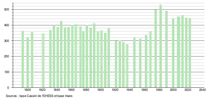 | L'évolution du nombre d'habitants est connue à travers les recensements de la population effectués dans la commune depuis 1793. Pour les communes de moins de 10 000 habitants, une enquête de recensement portant sur toute la population est réalisée tous les cinq ans, les populations de référence des années intermédiaires étant quant à elles estimées par interpolation ou extrapolation[27]. Pour la commune, le premier recensement exhaustif entrant dans le cadre du nouveau dispositif a été réalisé en 2007[28]. En 2022, la commune comptait 445 habitants[Note 4], en évolution de −1,33 % par rapport à 2016 (Hautes-Pyrénées : +1,59 %, France hors Mayotte : +2,11 %). |