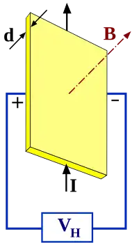 Lorsqu'un courant électrique I parcourt un matériau semi-conducteur soumis à un champ magnétique perpendiculaire au déplacement du courant, il apparaît alors une tension de Hall Vh, perpendiculaire au champ magnétique. Cette tension est proportionnelle au courant qui circule ainsi qu'au champ magnétique présent, soit[5] :