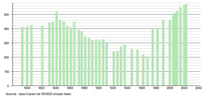 L'évolution du nombre d'habitants est connue à travers les recensements de la population effectués dans la commune depuis 1793. Pour les communes de moins de 10 000 habitants, une enquête de recensement portant sur toute la population est réalisée tous les cinq ans, les populations de référence des années intermédiaires étant quant à elles estimées par interpolation ou extrapolation[31]. Pour la commune, le premier recensement exhaustif entrant dans le cadre du nouveau dispositif a été réalisé en 2004[32].