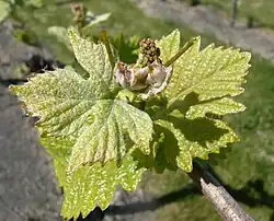 Les jeunes feuilles sont de couleur verte ou jaune. Les feuilles adultes sont de couleur vert foncé à très foncé, entières, à 3 ou 5 lobes avec un sinus pétiolaire peu ouvert ou fermé, des lobes s'opposant vers la face inférieure en « crête de coq », des dents courtes, un limbe tourmenté fortement bullé et, en face inférieure, une faible densité de poils couchés.