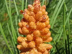 Les cônes mâles de 20 à 22 mm de long sont ovoïdes, écailleux, de couleur brun-orangé à maturité. Ils se forment à la base des pousses longues de l'année et produisent une grande quantité de pollen jaune, dispersé par le vent (plante anémogame). Certaines années, la quantité de pollen produit est telle que près des arbres, les grains jaunes semblent pleuvoir. Ce phénomène est localement dénommé « pluies de soufre »[3].