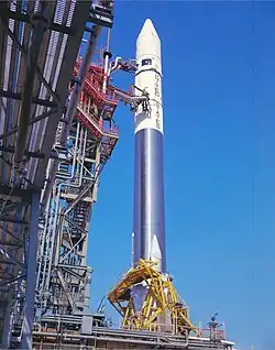- ↑ Il s'agit d'un étage supérieur des lanceurs Delta 1914, dérivé du système propulsif chargé de freiner les sondes lunaires du programme Surveyor avant leur atterrissage.