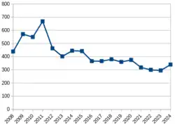 D'après le MICA (Maritime Information Cooperation and Awareness Center, centre d'expertise français dédié à la sûreté maritime mondiale), depuis 2008, après un pic de 668 actes de piraterie et de brigandage maritime en 2011, la tendance a été à la baisse jusqu'en 2016, et depuis le nombre d'actes recensés s'est stabilisé à moins de 400 (entre 295 et 380)[50],[51]. D'après le BIM (Bureau maritime international, organisme référence pour la lutte contre la piraterie), après une baisse temporaire de la piraterie dans les années 2020-2022, qui peut être liée à la pandémie de Covid-19, un regain est observé en 2024 en termes de recours aux armes, de prises d'otages et d'abandons de navires (312 navires abandonnés contre 132 en 2023, soit une hausse de 136 %)[52].