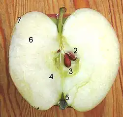Un piridion de pomme : 1. pédoncule 2. graine (pépin) 3. endocarpe 4. mésocarpe 5. calice 6. pulpe 7. épicarpe (peau).
