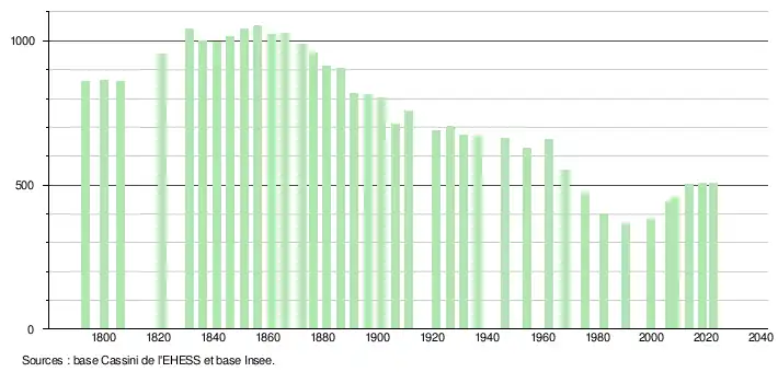 L'évolution du nombre d'habitants est connue à travers les recensements de la population effectués dans la commune depuis 1793. Pour les communes de moins de 10 000 habitants, une enquête de recensement portant sur toute la population est réalisée tous les cinq ans, les populations de référence des années intermédiaires étant quant à elles estimées par interpolation ou extrapolation[15]. Pour la commune, le premier recensement exhaustif entrant dans le cadre du nouveau dispositif a été réalisé en 2008[16].