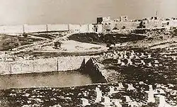 Légende : Birket Mamilla communément appelée la « piscine supérieure de Gihon », entourée de tombes, avec la porte de Jaffa en arrière-plan, v. 1877.