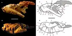 - ↑ (en) Godoy PL, Montefeltro FC, Norell MA, Langer MC, « An Additional Baurusuchid from the Cretaceous of Brazil with Evidence of Interspecific Predation among Crocodyliformes », PLoS ONE, vol. 9, no 5, , p. 1–12 (PMID 24809508, PMCID 4014547, DOI 10.1371/journal.pone.0097138)