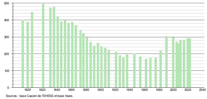 L'évolution du nombre d'habitants est connue à travers les recensements de la population effectués dans la commune depuis 1793. Pour les communes de moins de 10 000 habitants, une enquête de recensement portant sur toute la population est réalisée tous les cinq ans, les populations de référence des années intermédiaires étant quant à elles estimées par interpolation ou extrapolation[25]. Pour la commune, le premier recensement exhaustif entrant dans le cadre du nouveau dispositif a été réalisé en 2004[26].