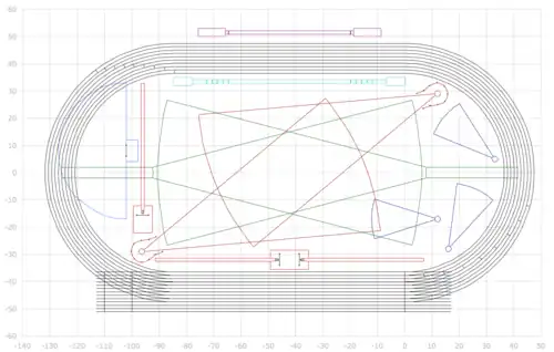 Les distances sont celles mesurées à 30 cm à l'intérieur du couloir pour le couloir no 1 et à 20 cm à l'intérieur du couloir pour les couloirs suivants. Le périmètre exact de la piste standard à la corde est de 398,12 mètres : longueur de 84,39 mètres et rayon de courbure de 36,50 mètres.