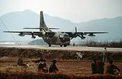 Un C-130 Hercules au roulage sur l'autoroute A29 près de la ville d'Ahlhorn pendant l'exercice de l'OTAN "Highway 84".