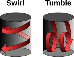 Un coefficient (sans dimension) de swirl () et de tumble () est généralement pris en compte. Celui-ci est de 1,0 ou 2,0 sur les moteurs produits en série mais peut atteindre jusqu'à 6,0. Ces coefficients prennent en compte les vitesses angulaires des jets de fluides et en fonction de la vitesse angulaire du vilebrequin [31].