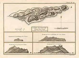 « we discovered land to the northward of us. Upon approaching it the next day (Friday, 3 July), it appeared like a great rock rising from the sea... and it having been discovered by a young gentleman, son to Major Pitcairn of the Marines, we called it Pitcairn’s Island[7]. »