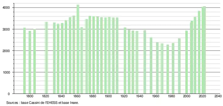 - ↑ Fiches Insee - Populations de référence de la commune pour les années 2006, 2007, 2008, 2009, 2010, 2011, 2012, 2013, 2014, 2015, 2016, 2017, 2018, 2019, 2020, 2021 et 2022.
