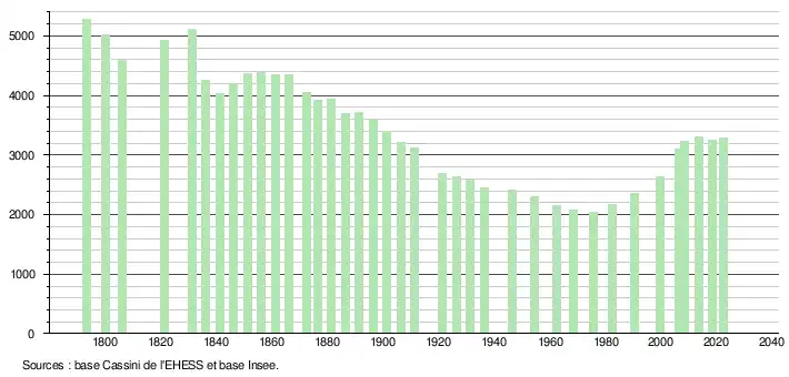 L'évolution du nombre d'habitants est connue à travers les recensements de la population effectués dans la commune depuis 1793. Pour les communes de moins de 10 000 habitants, une enquête de recensement portant sur toute la population est réalisée tous les cinq ans, les populations de référence des années intermédiaires étant quant à elles estimées par interpolation ou extrapolation[33]. Pour la commune, le premier recensement exhaustif entrant dans le cadre du nouveau dispositif a été réalisé en 2008[34].