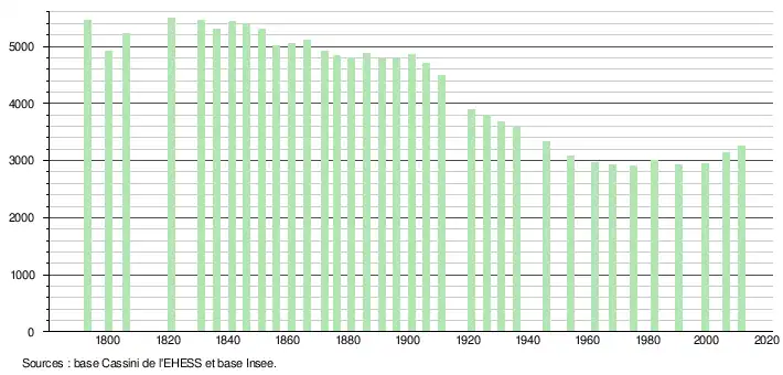 L'évolution du nombre d'habitants est connue à travers les recensements de la population effectués dans la commune depuis 1793. À partir du , les populations légales des communes sont publiées annuellement dans le cadre d'un recensement qui repose désormais sur une collecte d'information annuelle, concernant successivement tous les territoires communaux au cours d'une période de cinq ans. Pour les communes de moins de 10 000 habitants, une enquête de recensement portant sur toute la population est réalisée tous les cinq ans, les populations légales des années intermédiaires étant quant à elles estimées par interpolation ou extrapolation[17]. Pour la commune, le premier recensement exhaustif entrant dans le cadre du nouveau dispositif a été réalisé en 2006[18],[Note 1].