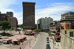 La place D'Youville Vue vers l'ouest avec le 800 d'Youville au centre | |