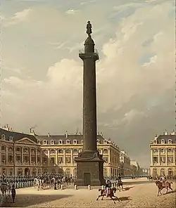 La colonne Vendôme est élevée en 1810 à l'emplacement de la statue de Louis XIV, par les architectes Jacques Gondouin et Jean-Baptiste Lepère, à l'imitation de la colonne Trajane de Rome, qui comporte également un bas-relief hélicoïdal. Celui-ci, sculpté par Étienne Bergeret, représente la campagne de 1806. La colonne est surmontée d'une statue de Napoléon en « César » par Antoine-Denis Chaudet. Connue du public sous le nom de colonne Vendôme, elle est initialement nommée colonne d’Austerlitz ou colonne de la Grande-Armée[4].