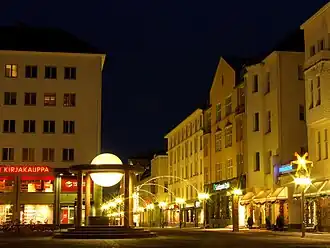 De l'autre côté de Kirkkokatu, la place centrale est bordée de bâtiments en pierre de style Art nouveau dont la maison Pallas, conçue en 1907 par l'architecte Valter Thomé et la banque d'épargne régionale d'Oulu conçue en 1911 par Wivi Lönn[2].