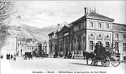 - No 9 : musée-bibliothèque de Grenoble : l'édifice, qui abrita la bibliothèque municipale jusqu'en 1970 et les collections du musée jusqu'en 1993, a été conçue par l'architecte Questel dans un style néo-Renaissance. Il fut inauguré en 1872 après plusieurs années de travaux interrompus par la guerre franco-allemande de 1870. La façade principale, sur la place de Verdun, est ornée de six sculptures protégées dans des niches et réalisées par le sculpteur grenoblois Henri Blanc-Fontaine. Celles-ci représentent du côté gauche les allégories de la Peinture, l'Architecture et la Sculpture et du côté droit, les allégories de la Poésie, de la Science et de l'Histoire[10].