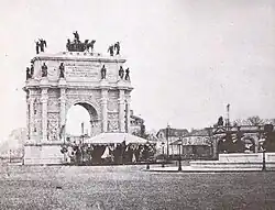 Lors de l’inauguration du boulevard du Prince-Eugène (actuel boulevard Voltaire), le , les Parisiens découvrent une maquette en grandeur réelle de l’arc de triomphe de trente mètres de hauteur, percé d’une seule ouverture, décoré de colonnes que surmontent des statues symbolisant les divers corps de troupe[9]. Au-dessus de l’attique se trouve un quadrige entouré de quatre Renommées.