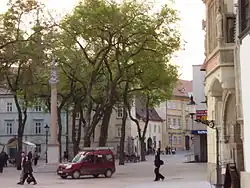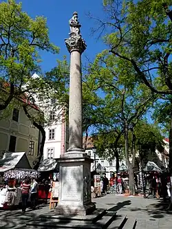 La place porte le nom du couvent franciscain du côté est. Un nouveau bâtiment moderne au sud de celui-ci, une maison de ville et l'église des Jésuites ainsi que l'église franciscaine située à l'angle nord-est de la place se trouvent du côté est de la place. À l'angle nord-ouest, on trouve le palais Mirbach, qui abrite la galerie de la ville de Bratislava, et des maisons de ville sur le côté ouest. Devant l'entrée de l'église des Jésuites se trouve une colonne mariale de 1675, non loin de là se trouve une sculpture d'une femme portant un vase (1804). Il y avait une fontaine de la Renaissance de 1592 et même plus tôt un asile pour aliénés mentaux, déjà mentionné dans un document de 1567, sous le nom de Newes Fool kheterlein am Brotmarkht.