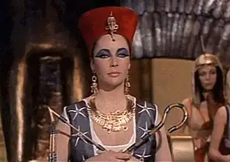 Lorsqu'on évoque la femme égyptienne, la première image qui vient majoritairement à l'esprit est celle de la reine Cléopâtre, ou plus précisément Cléopâtre VII. Bien que la dynastie lagide soit d'origine grecque, ce sera elle qui sera associée à l'image de la femme égyptienne, pour de nombreuses générations. Cela, en grande partie grâce ou à cause du cinéma, plus précisément des films américains durant l'âge d'or d'Hollywood. En effet, dans les années 1960, de nombreux films péplums seront produits à cette époque, mettant en scène la femme égyptienne telle qu'elle est rêvée dans cette époque où c'est le glamour qu'on cherche à montrer. Ainsi, c'est en 1963 qu'est immortalisée la reine dans son image glamour, dans le film Cléopâtre de Joseph L. Mankiewicz, sous les traits de l'actrice Elizabeth Taylor. Cet engouement pour la reine s'explique par la vie tumultueuse qu'elle vécut, faite d'intrigues, de passions (ses deux plus célèbres amants, César et Marc Antoine), de pouvoir, et de tragique (elle se suicida). Elle concentre alors à l'époque toute une fantasmagorie sur elle ; par sa beauté, en tant que femme de pouvoir (donc pouvant se montrer cruelle), amante des plus grands de l'époque, etc. Bref, elle fascine, par sa vie et ce qu'elle fut ; de plus, associée à l'Égypte, elle dégage pour les spectateurs une aura de mystère, celle qui entoure l'Égypte ésotérique — celle-là même qui stimula également l'imagination avec les malédiction de momies, ou d'autres secrets de tombeaux. Présentée ainsi, la femme égyptienne devient de la sorte séductrice, fascinante dans une vision d'elle romantique.
