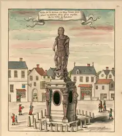 Cette œuvre du sculpteur poitevin Girouard, tout en pierre peinte en bronze, représentait le roi debout, habillé à la romaine avec un manteau fleurdelisé. Le piédestal était enrichi de sculptures, et ses quatre coins soutenus par des Termes représentant les diverses nations vaincues par le roi lors de ses guerres[2].