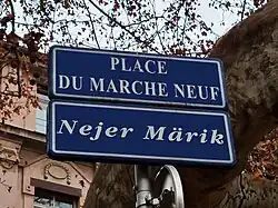 À partir de 1995, des plaques de rues bilingues, à la fois en français et en alsacien, sont mises en place par la municipalité lorsque les noms de rue traditionnels étaient encore en usage dans le parler strasbourgeois[8]. La place est ainsi sous-titrée Nejer Märik.