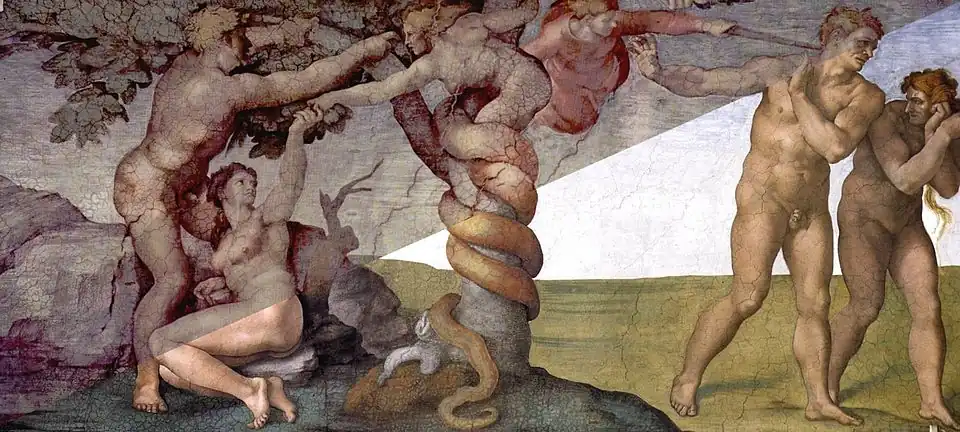 Le thème iconographique de la chapelle Sixtine résume le salut de l’humanité, offert par Dieu en la personne de son fils Jésus. L’ancienne alliance, passée entre Dieu et le peuple d’Israël par l’entremise de Moïse, et la nouvelle alliance, passée entre Dieu et l’humanité tout entière à travers le Christ, sont représentées sur les murs latéraux de la chapelle. La partie centrale du plafond représente la Création, le Paradis terrestre puis la chute de l’humanité, Adam et Ève et le péché originel, qui rompt l'alliance entre Dieu et l'humanité. Entourant ce thème central, les prophètes et les sybilles rappellent constamment que Dieu n'a jamais abandonné les hommes, mais qu'il leur offre le salut. Tout autour est illustrée la lignée qui, d’Adam au roi David, mène à Jésus-Christ, sauveur de l’humanité : rappel du plan divin qui, dès l'expulsion du Paradis terrestre, inclut la possibilité du salut[51].