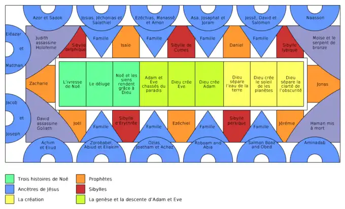 Condivi cite l'Ancien Testament comme source scripturale de la voûte. Les neuf champs du plafond de celle-ci, dont cinq sont de dimension inférieure aux quatre autres, montrent une série d'épisodes de la Genèse jusqu'à l'Ivresse de Noé, les cinq champs de dimension inférieure étant flanqués de dix médaillons présentant d'autres scènes de l'Ancien Testament. Les quatre pendentifs des quatre coins de la voûte renvoient aussi à des sujets de l'Ancien Testament qui traitent de la salvation du peuple juif dans différentes situations de graves dangers (Le Serpent d'Airain, Le Châtiment d'Haman, David et Goliath, Judith et Holopherne). Sept Prophètes et cinq Sibylles sont représentés entre les voûtains des deux côtés longitudinaux, et sur les côtés transversaux, entre les pendentifs d'angle, parmi lesquels figurent, au-dessus du mur de l'autel, à l'extrémité ouest de la voûte, la puissante figure de Jonas et, du côté opposé, un Zacharie un peu moins monumental. Dans les huit voûtains des murs longitudinaux et sur les douze surfaces murales des lunettes, figurent les ancêtres du Christ, tels qu'ils sont énumérés au début de l'Évangile de Matthieu[18].