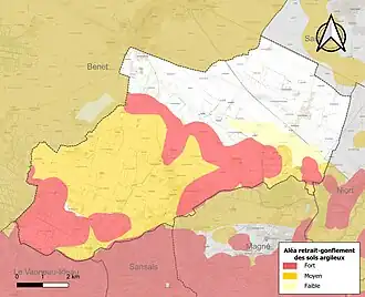Les mouvements de terrains susceptibles de se produire sur la commune sont des mouvements de terrains, notamment des tassements différentiels[18]. Le retrait-gonflement des sols argileux est susceptible d'engendrer des dommages importants aux bâtiments en cas d’alternance de périodes de sécheresse et de pluie[19]. 61,4 % de la superficie communale est en aléa moyen ou fort (54,9 % au niveau départemental et 48,5 % au niveau national)[Carte 2]. Depuis le , en application de la loi ELAN, différentes contraintes s'imposent aux vendeurs, maîtres d'ouvrages ou constructeurs de biens situés dans une zone classée en aléa moyen ou fort[Note 2],[20].