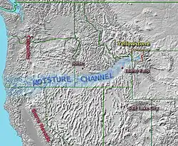 Le déplacement de la plaque tectonique sur le point chaud de Yellowstone a créé un passage de plus de 100 km de large à travers les montagnes Rocheuses, entre la chaîne des Cascades au nord et la Sierra Nevada au sud. L'absence de hautes montagnes facilite le passage d'un courant humide prenant naissance dans l'océan Pacifique et se déplaçant vers Yellowstone. Ce courant apporte à la région des précipitations sous forme de pluie ou de neige[1]. Son climat se rapproche donc de celui de l'ouest des Rocheuses, alors que Yellowstone se situe à l'est de celles-ci.