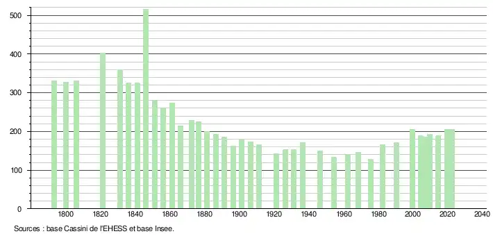 L'évolution du nombre d'habitants est connue à travers les recensements de la population effectués dans la commune depuis 1793. Pour les communes de moins de 10 000 habitants, une enquête de recensement portant sur toute la population est réalisée tous les cinq ans, les populations de référence des années intermédiaires étant quant à elles estimées par interpolation ou extrapolation[27]. Pour la commune, le premier recensement exhaustif entrant dans le cadre du nouveau dispositif a été réalisé en 2004[28].