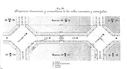 Les rues avaient dans leur majorité une largeur de 20 mètres. Dans leur configuration actuelle, les 10 mètres du centre sont occupés par la chaussée, et les 10 mètres restant sont répartis en deux trottoirs de 5 mètres chacun. Cerdà avait été présent lors des révoltes ouvrières de 1855[28]. La largeur des rues, comme dans le modèle parisien d'Haussmann, étaient associée à une vision militaire qui devait permettre de réprimer facilement les émeutes. Nombre d'éloges de ses contemporains se concentraient sur l'avantage des rues rectilignes pour les charges d'artillerie[28].