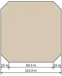 Cerdà définit les dimensions des îlots par les distances entre les axes des rues en incluant la largeur de ces dernières. En considérant la largeur de rues standard de 20 mètres, l'ingénieur conçut des îlots formés par un carré de 113,33 mètres de côté dont les arêtes furent coupées par un chanfrein de 45 degrés[33]. Il spécifia des chanfreins de 15 mètres de long, ce qui correspondait une superficie de 1,24 hectare par îlot[note 1]. La valeur de 113,33 mètres de côté a reçu plusieurs justifications. Certains remarquèrent que cela correspond à 9 îlots par kilomètre. Manuel de Solà-Morales considéra que les cinq îlots entre l'ancien boulevard des Artisan (place de l'université) et la Jonquere (place Urquinaona) furent ceux qui déterminèrent cette valeur[34].