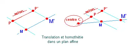 L'ensemble réunion des translations et des homothéties est parfois appelé l'ensemble des dilatations du plan affine (à ne pas confondre avec Dilatation (géométrie)). On peut démontrer que c'est un groupe.