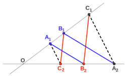 On suppose les points A1, B1 et C1 alignés, les points A2, B2 et C2 sont également alignés sur une droite sécante avec la précédente en O, et les droites (B1C2) et (C1B2) parallèles, de même que les droites (A1B2) et (B1A2).