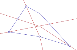 - les droites de Moulton (BC') et (CB') en rouge, se coupent en un point en noir sur la figure ;