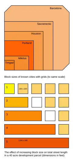 Taille des blocs et des longueurs de rue, mesurée en pieds impériaux : à Barcelone, les îlots font 113,33 mètres de côté.