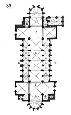 - deux nefs collatérales (E et H) encadrent la nef principale ;