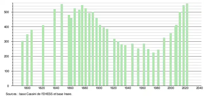 L'évolution du nombre d'habitants est connue à travers les recensements de la population effectués dans la commune depuis 1793. Pour les communes de moins de 10 000 habitants, une enquête de recensement portant sur toute la population est réalisée tous les cinq ans, les populations de référence des années intermédiaires étant quant à elles estimées par interpolation ou extrapolation[11]. Pour la commune, le premier recensement exhaustif entrant dans le cadre du nouveau dispositif a été réalisé en 2007[12].