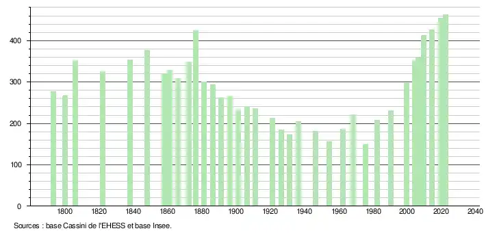 L'évolution du nombre d'habitants est connue à travers les recensements de la population effectués dans la commune depuis 1793. Pour les communes de moins de 10 000 habitants, une enquête de recensement portant sur toute la population est réalisée tous les cinq ans, les populations de référence des années intermédiaires étant quant à elles estimées par interpolation ou extrapolation[8]. Pour la commune, le premier recensement exhaustif entrant dans le cadre du nouveau dispositif a été réalisé en 2004[9].