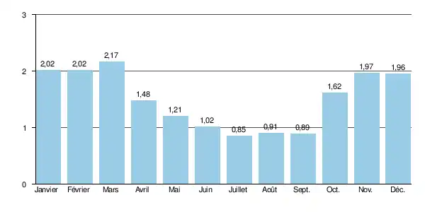 Le module de la rivière y est de 1,51 m3/s pour une surface de bassin de 30 km2.