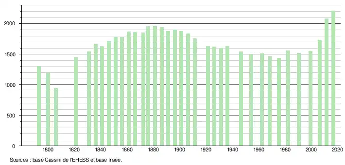 L'évolution du nombre d'habitants est connue à travers les recensements de la population effectués dans la commune depuis 1793. Pour les communes de moins de 10 000 habitants, une enquête de recensement portant sur toute la population est réalisée tous les cinq ans, les populations de référence des années intermédiaires étant quant à elles estimées par interpolation ou extrapolation[6]. Pour la commune, le premier recensement exhaustif entrant dans le cadre du nouveau dispositif a été réalisé en 2006[7].