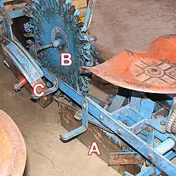 Vue de dessus d'un élément semeur à disques.Rangs de choux juste repiqués et plateaux de plants.Vue d'un élément repiqueur (Monosem Super-Prefer) sur une machine ancienne. A: système ouvreur à socs. B: roue porteuse. C; Distributeur rotatif des plants semi-automatique.