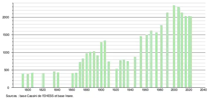 L'évolution du nombre d'habitants est connue à travers les recensements de la population effectués dans la commune depuis 1793. Pour les communes de moins de 10 000 habitants, une enquête de recensement portant sur toute la population est réalisée tous les cinq ans, les populations de référence des années intermédiaires étant quant à elles estimées par interpolation ou extrapolation[23]. Pour la commune, le premier recensement exhaustif entrant dans le cadre du nouveau dispositif a été réalisé en 2005[24].