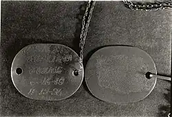 « Une plaque d'identification en aluminium, de la taille d'un demi-dollar argenté et de l'épaisseur appropriée, emboutie avec le nom, le rang, la compagnie, le régiment du porteur, sera portée par chaque dirigeant et homme enrôlé dans l'armée et toutes les fois où le soldat est sur le champ de bataille. La plaque est à suspendre au cou, sous l'habillement, par une corde ou une lanière passée par un petit trou. On la prescrit comme pièce de l'uniforme et quand elle est non utilisée comme indiqué ci-dessus sera habituellement maintenue en possession du propriétaire. La plaque sera publiée par le Département de la Guerre à titre gratuit aux hommes enrôlés […] »