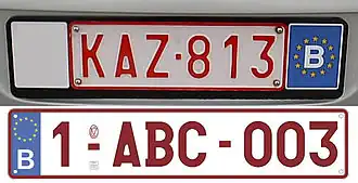 Les nouvelles plaques au format européen (deux formats restent possibles: rectangulaire ou carré) sont de couleur rubis type RAL.3003 sur fond blanc. Il y a 7 caractères au lieu de 6, séparés par des tirets et non plus par des points, et le drapeau européen ainsi que le B y figurent, sur fond bleu, à gauche de la plaque.