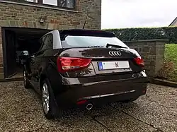 La plaque arrière était jadis souvent attachée sur un porte plaque qui affiche une lettre B et une publicité pour le concessionnaire automobile ou parfois ornée d'un drapeau européen.