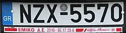 Les plaques d'immatriculation grecques actuelles sont composées de 3 lettres et 4 chiffres par plaque. (ex: